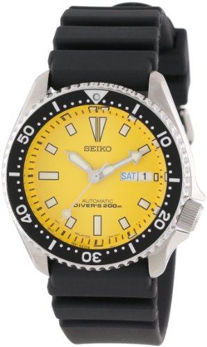 This 21-jewel, automatic watch winds itself with the motion of your wrist, so you'll never need to change the battery. It has a stainless steel case and features a bright yellow dial with three-hand function, easy-to-read bar markers, and an English/Spanish day/date window at the three o'clock position. Additional features include a screw-down case and crown, a scratch-resistant Hardlex crystal, and a one-way rotating bezel that keeps track of elapsed time, so you can time dives or other events. With its bright colors and Lumibrite hands, markers, and bezel, this watch is easy to read in both light and dark conditions. The watch secures to a comfortable, extra-long, pressure-vented urethane strap that fastens with a buckle closure. Designed specifically for diving, this watch is water-tested to 200 meters. It meets ISO standards and is suitable for scuba diving.